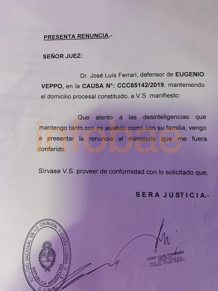 Ferrari lo anunció en el programa de Chiche Gelblung en Crónica TV, del que es un panelista habitual. Luego se lo confirmó a Infobae. «Veppo me mintió», aseguró el abogado, que señaló «desinteligencias con el imputado y su familia».