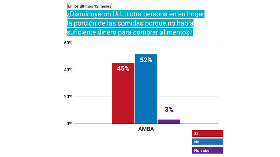 Cerca de la mitad de los entrevistados afirmó haber disminuido la porción de comida por problemas de ingresos. En el segundo cordón del Conurbano los que tuvieron que pasar por esta experiencia llegan al 57 por ciento.