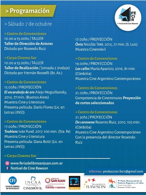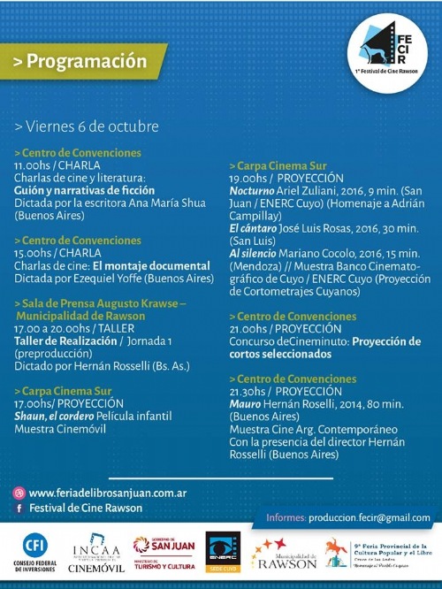 Se presentarán diferentes muestras de cine argentino contemporáneo, cine literatura, cortometrajes y largometrajes cuyanos. Además, concurso Cineminuto. También se harán talleres de realización, de dirección de actores, de guión, etc.