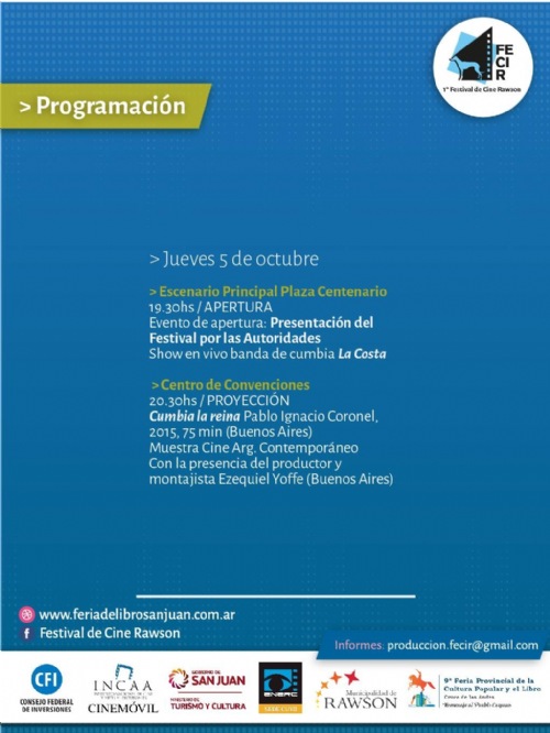 Hoy jueves 5 de octubre comienza el Festival de Cine en el departamento de Rawson en el marco de la Feria del Libro. Iniciativa de  ENERC Cuyo junto con Secretaría de Cultura del Municipio son los responsable y organizadores del evento.
