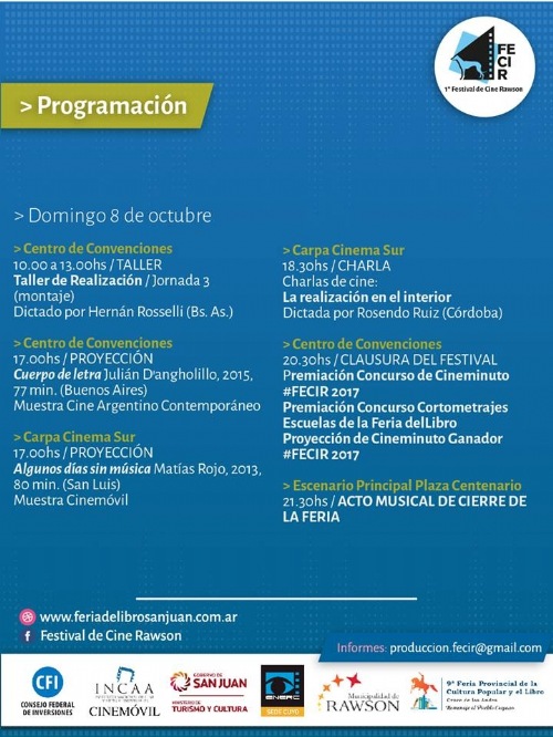 Hoy jueves 5 de octubre comienza el Festival de Cine en el departamento de Rawson en el marco de la Feria del Libro. Iniciativa de ENERC Cuyo junto con Secretaría de Cultura del Municipio son los responsable y organizadores del evento.
