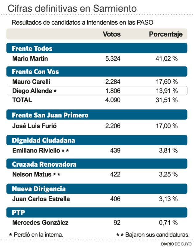 Después de las Primarias Abiertas, Simultáneas y Obligatorias (PASO), gran parte de la oposición se unió tras la figura del macrista Mauro Carelli para tratar de derrotar al jefe comunal peronista Mario Martín, que va por la reelección. El basualdista Diego Allende, que cayó en la interna del Frente Con Vos contra el hombre del Pro, lo viene acompañando y los que encabezaban las listas para intendente de Dignidad Ciudadana, Emiliano Riviello, y Cruzada Renovadora, el bloquista Nelson Matus, bajaron sus candidaturas y también se sumaron al proyecto. La suma de los votos que obtuvieron todos juntos no emparda a la del líder departamental, pero se le aproxima y el objetivo del grupo es mantener ese caudal y pescar los apetecibles sufragios que cosechó el que salió tercero y que no se incorporó a la alianza, José Luis Furió, del Frente San Juan Primero.