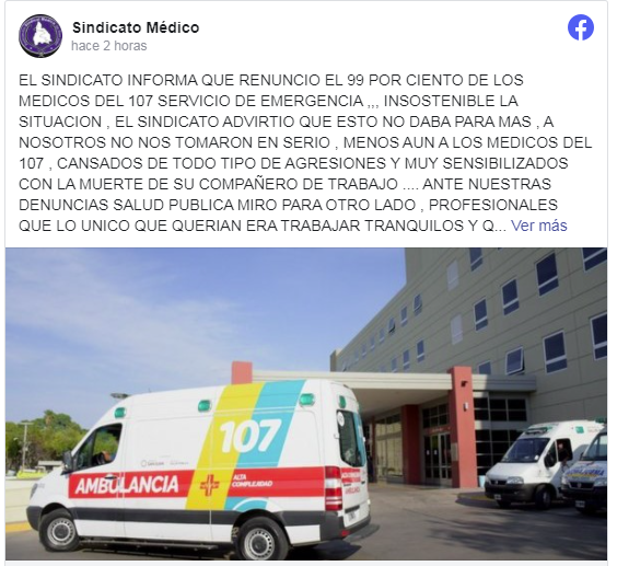 Este lunes en la siesta el Sindicato Médico de San Juan realizó una publicación en la que aseguró que renunció el 99% del plantel de profesionales pertenecientes al Servicio de Emergencia 107.