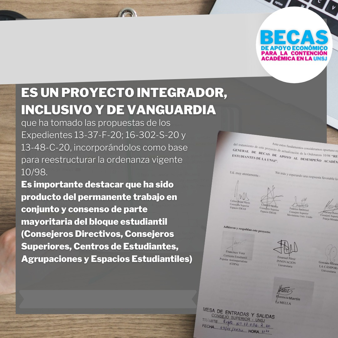 Ayer miércoles 4 de noviembre con una fuerte y solida unidad, varias agrupaciones estudiantiles y centros de estudiantes (Espacio Ideas, Movimiento Universitario Unido , Corriente Estudiantil Antiimperialista, La Mella, La Campora Universidad, Franja Morada, Agrupación Principios, Movimiento Nacional Reformista), debido a la preocupación por la falta de perspectiva social en las becas en el contexto de pandemia, presentaron un proyecto integral de modificación de la ordenanza de becas de la UNSJ.