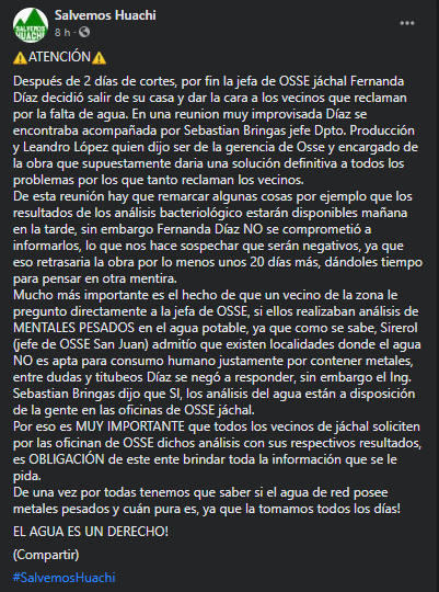 Mucho más importante es el hecho de que un vecino de la zona le pregunto directamente a la jefa de OSSE, si ellos realizaban análisis de MENTALES PESADOS en el agua potable, ya que como se sabe, Sirerol (jefe de OSSE San Juan) admitió que existen localidades donde el agua NO es apta para consumo humano justamente por contener metales, entre dudas y titubeos Díaz se negó a responder, sin embargo el Ing. Sebastian Bringas dijo que SI, los análisis del agua están a disposición de la gente en las oficinas de OSSE Jáchal”.