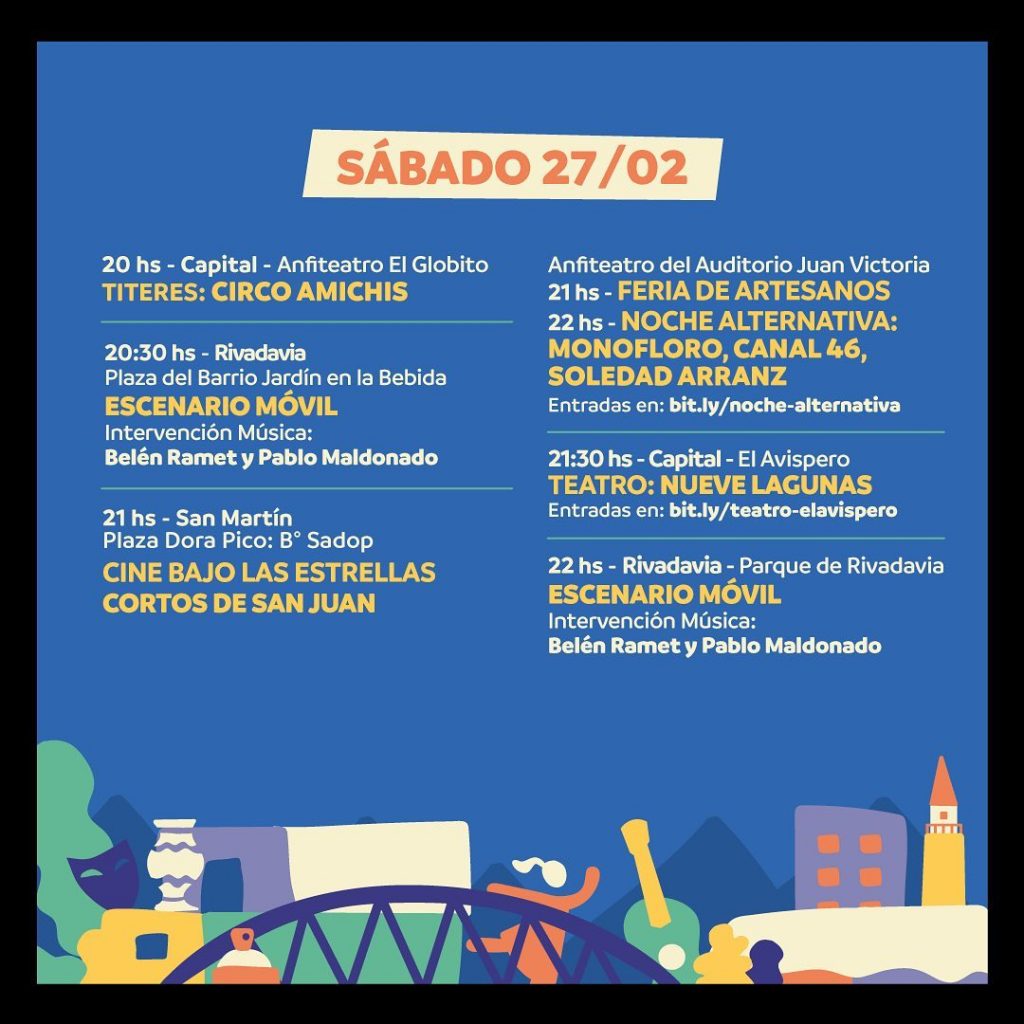 El sábado 27, el Verano Cultural llegará a Calingasta y Valle Fértil con “Fotógrafos+Croquiseros en Patrimonio”, “Circo de variedades”, entre otras opciones. Capital Rivadavia, San Martín, Rawson y Albardón también se agregan al cronograma para este día con la Feria de Artesanos y la Noche alternativa en el Anfiteatro Buenaventura Luna, mientras que el escenario móvil estará en el Parque de Rivadavia y el Cine Móvil en San Martín.