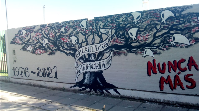 Esta mañana en las afueras del Complejo Polideportivo Universitario “El Palomar” se realizó un mural por la memoria y justicia, donde además en los parques del complejo se plantaron árboles.