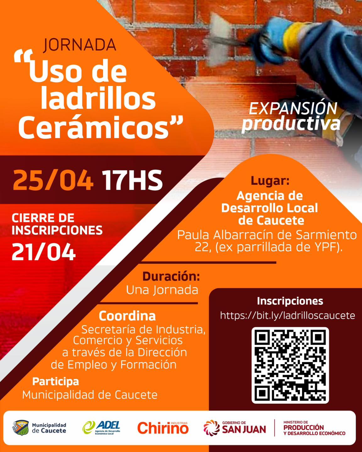 La Agencia de Desarrollo Local, en conjunto con la Secretaría de Obras Públicas de la Municipalidad de Caucete y la Secretaría de Industria, Comercio y Servicios, llevará a cabo una jornada sobre el uso de ladrillos cerámicos en el departamento.