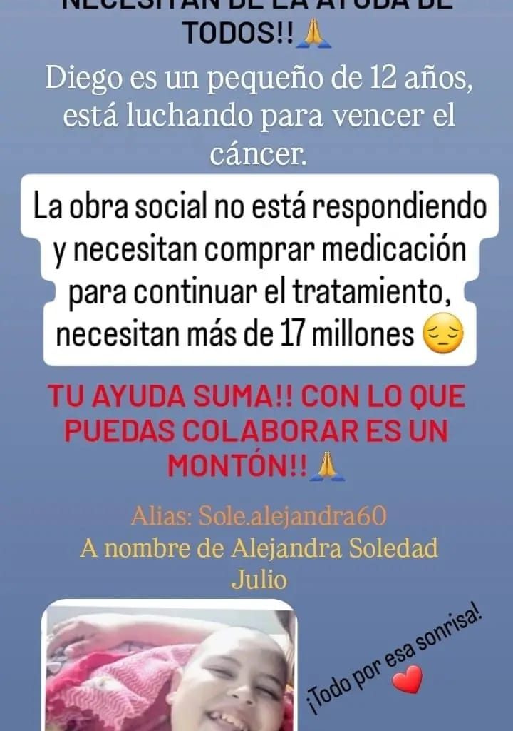 Diego tiene 12 años y desde agosto enfrenta una batalla durísima: le diagnosticaron leucemia linfoblástica aguda agresiva. Desde entonces, su mamá, Soledad Julio, vive una carrera contrarreloj para conseguir los medicamentos que necesita su hijo. La medicación principal, Oncaspar, cuesta más de 17 millones de pesos, y la obra social OSPEB (Panaderos Omega Salud) no da respuesta desde hace meses.