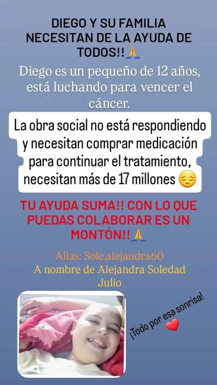 Diego tiene 12 años y desde agosto enfrenta una batalla durísima: le diagnosticaron leucemia linfoblástica aguda agresiva. Desde entonces, su mamá, Soledad Julio, vive una carrera contrarreloj para conseguir los medicamentos que necesita su hijo. La medicación principal, Oncaspar, cuesta más de 17 millones de pesos, y la obra social OSPEB (Panaderos Omega Salud) no da respuesta desde hace meses.