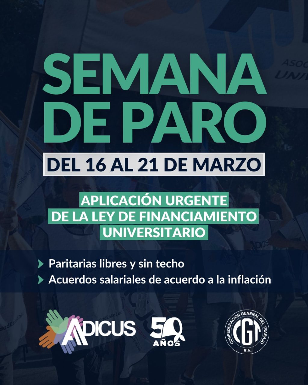 Desde el gremio ADICUS (Asociación de Docentes, Investigadores y Creadores Universitarios Sanjuaninos), adherido a la Confederación General del Trabajo, informaron que el paro busca visibilizar la situación que atraviesa el sector universitario en materia salarial y presupuestaria.