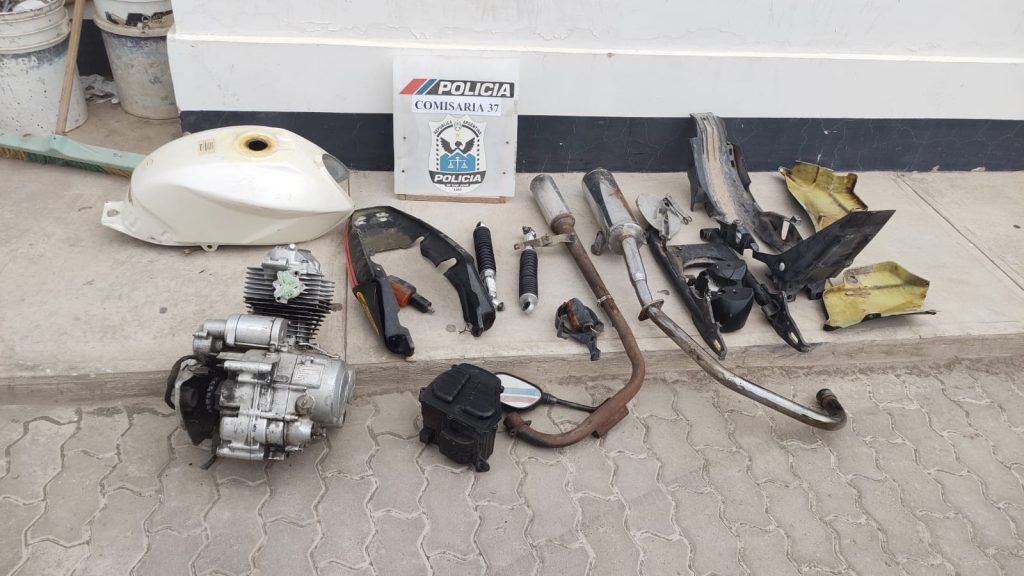 El allanamiento en Jardín Libertad arrojó numerosas piezas: motor Motomel, orquillón, dos escapes de competición, tanque, amortiguador, plásticos y tornillería, vinculadas a Sandovares, mayor de edad.